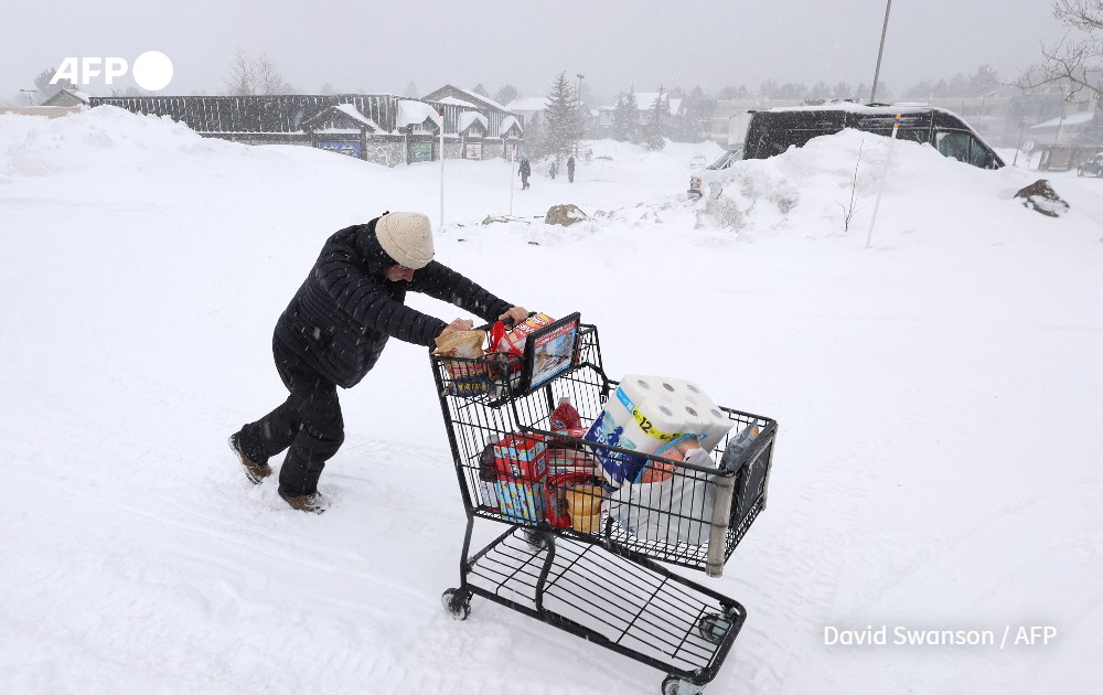 A customer pushes their grocery cart through the snow to their car as a blizzard hits Mammoth Lakes, California, on March 2, 2024. The National Weather Service has issued a blizzard warning for California's entire Sierra Nevada through early March 3, 2024. Forecasters report the storm could bring three to five inches (8 to 13 cms) of snow per hour.​