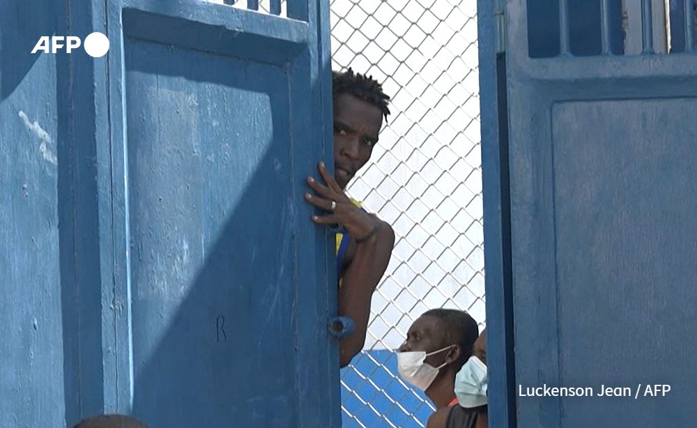 A person looks out from behind a door near the main prison in Port-au-Prince, Haiti, on March 3, 2024, following a breakout involving several thousand inmates. The incident, instigated by gang members, resulted in at least a dozen deaths.