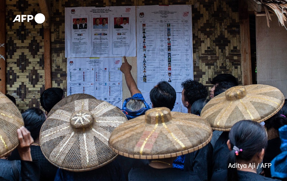 Members of the indigenous Baduy tribe check the candidate list at a polling station before casting their ballots in Indonesia’s presidential and legislative elections. Kanekes Village, Lebak, Banten province, February 14, 2024.