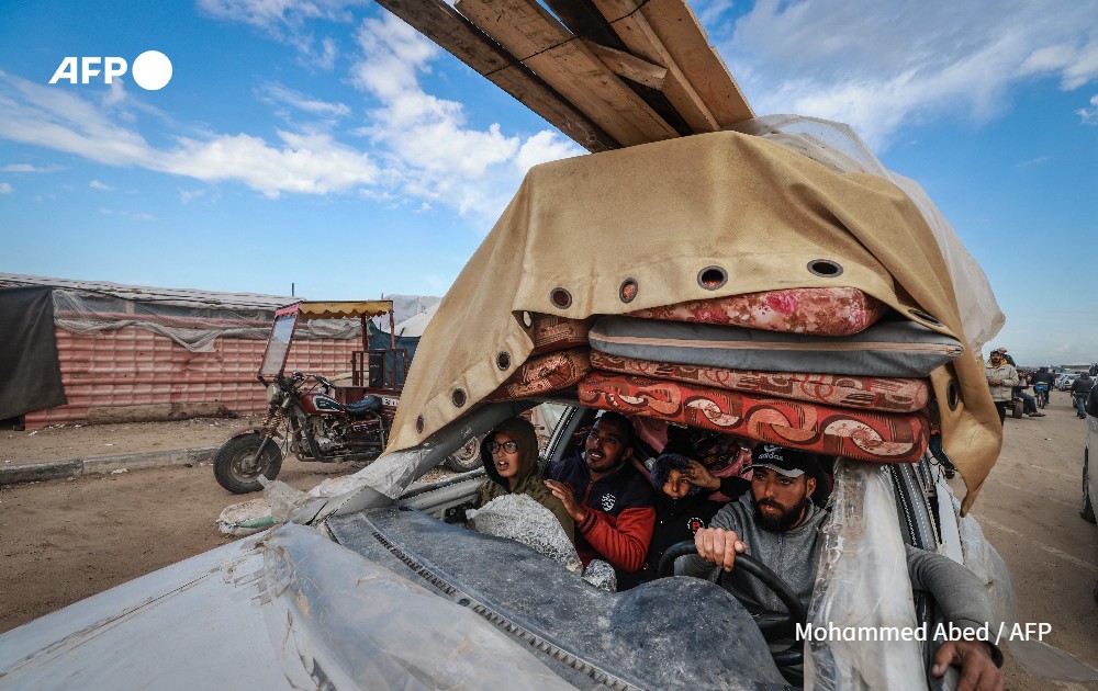 Palestinians fleeing Khan Yunis arrive in Rafah with their belongings in a damaged car on February 15, 2024, as battles raged in the southern Gaza Strip between Israel and the Palestinian militant group Hamas.