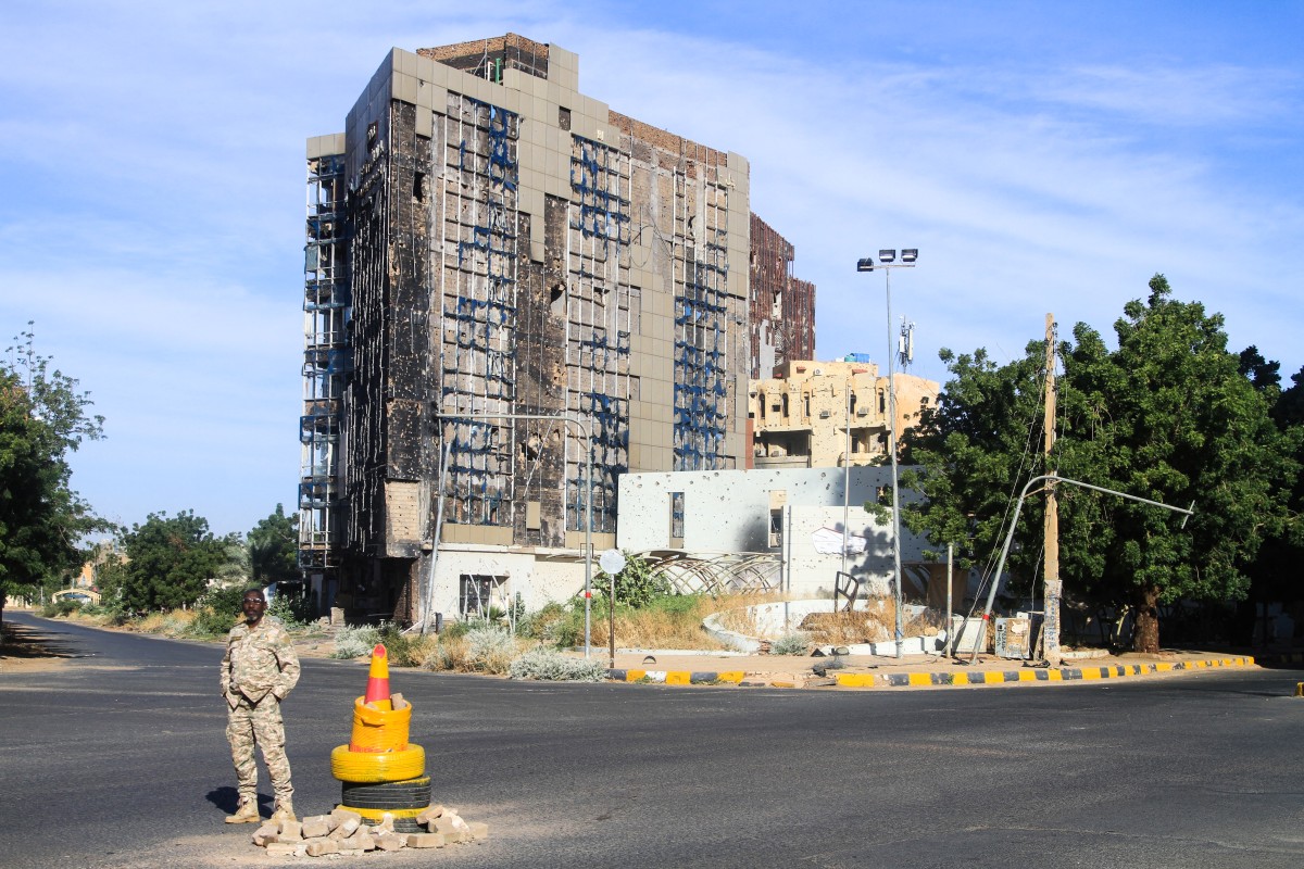 Un membre des forces de sécurité se tient devant un immeuble de grande hauteur détruit, alors que les efforts pour rétablir les infrastructures de la ville reprennent après près de trois années de dévastation causée par la guerre, à Khartoum, le 17 janvier 2026. Le Premier ministre du Soudan a annoncé le 11 janvier 2026 le retour du gouvernement à Khartoum, après près de trois ans d’exercice depuis sa capitale de guerre, Port-Soudan. © Ebrahim Hamid / AFP