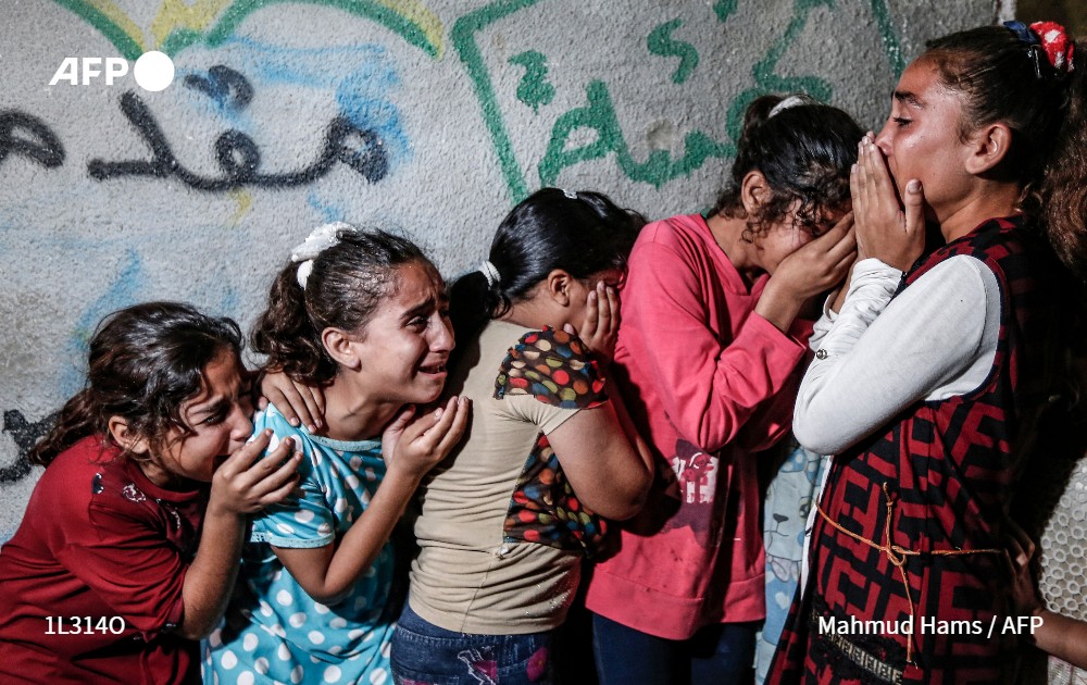 Des proches d’Alaa Hamdan, assistent à ses funérailles à Beit Hanoun, dans le nord de la bande de Gaza, le 4 octobre 2019. Agé de 28 ans, Alaa Hamdan a été tué par des tirs israéliens près de Jabalia, dans le nord de Gaza lors de heurts près de la barrière séparant Israël de la bande de Gaza.