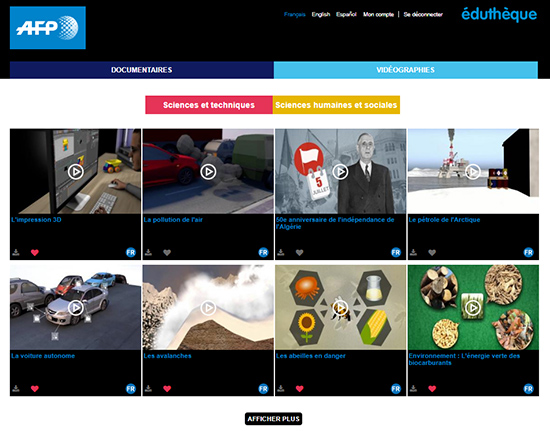 L’AFP donne aux élèves les mêmes possibilités de navigation et de téléchargement de ses dossiers documentaires et de vidéographies. L’offre est structurée en trois grands thèmes – arts et lettres, sciences et techniques, sciences humaines et sociales –, mais aussi par niveaux et sujets : « la voiture autonome », « la grotte Chauvet », « les villes durables », « les drones civils », « la maison connectée », « la déforestation », « le Parlement européen » ou encore « les migrations dans le monde » pour ne citer que quelques exemples.