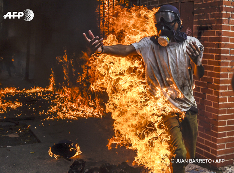 3 mai 2017 – Venezuela, Caracas - Un manifestant en feu lors d’affrontements avec les forces de l’ordre pendant une manifestation contre le président vénézuélien Nicolas Maduro. © JUAN BARRETO / AFP PHOTO