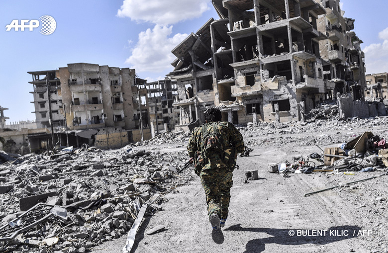 1er octobre 2017 – Syrie, Raqa - Un membre des Forces démocratiques syriennes court se mettre à l’abri des tirs d’un sniper près de l’hôpital de Raqa. © BULENT KILIC / AFP PHOTO