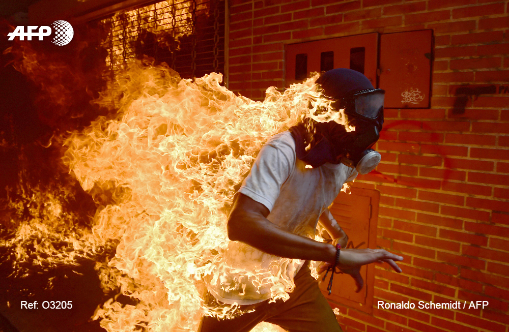 Un jeune homme transformé en torche humaine, courant pour échapper aux flammes, un masque à gaz sur le visage, lors des violentes manifestations au Venezuela : c’est l’une des images percutantes du photographe de l’AFP Ronaldo Schemidt, qui figure parmi les six finalistes pour le prestigieux World Press Photo 2018.