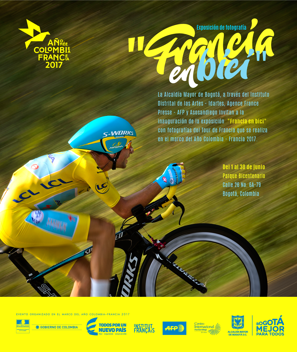 La Alcaldía Mayor de Bogotá, a través del Instituto Distrital de las Artes - Idartes , la AFP - Agence France Presse y Asosandiego invita a la inauguración de la exposición de fotografías del Tour de Francia: Francia en bici.
