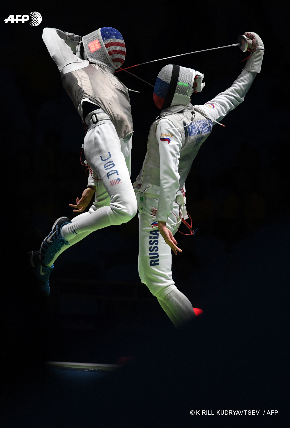 12 août 2016 – Rio de Janeiro, Brésil – L’Américain Gerek Meinhardt (G) est opposé au Russe Artur Akhmatkhuzin lors de la demi-finale de fleuret par équipes des jeux Olympiques de Rio. © AFP PHOTO / KIRILL KUDRYAVTSEV